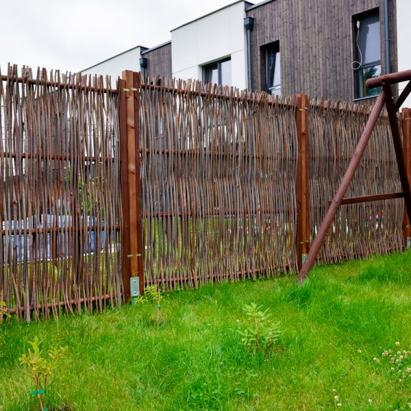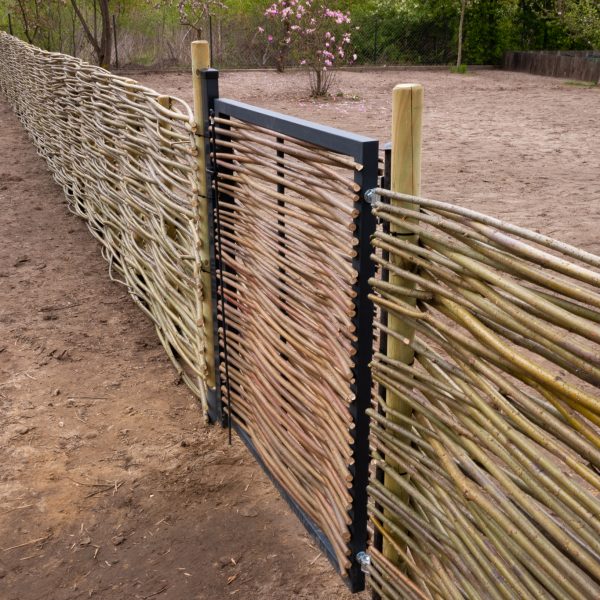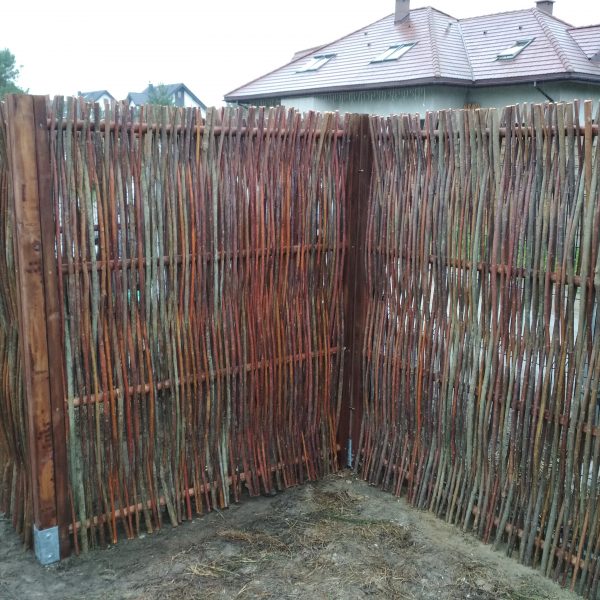 Moduły płotu pionowego mają wymiar do 2 metrów wysokości i szerokości. Z suchych kijów budujemy także bramy i furtki.